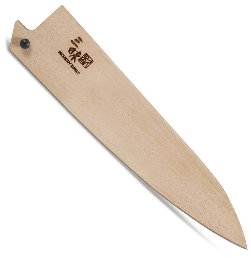 Mcusta Black wooden lacquered sheath Saya suitable for a Japanese Petty knife with a blade length of up to 15 cm. Mcusta Zanmai Saya are made from magnolia wood harvested from Honoki trees in Japan, the same material used for centuries to protect Japanese Katana swords. The magnolia wood sheath is moisture resistant and soft, which won't scratch the elegant blades.  For safety purposes, a pin is used to hold the blade and sheath in place. *There is a possibility that the saya sheath will not fit your knife. Because the actual thickness and size of a knife can vary, even if their stated blade size looks the same in the spec. This saya is 100% suitable for Mcusta Zanmai Petty knife with a blade length of up to 15 cm. For models from other manufacturers, please ask our consultants.