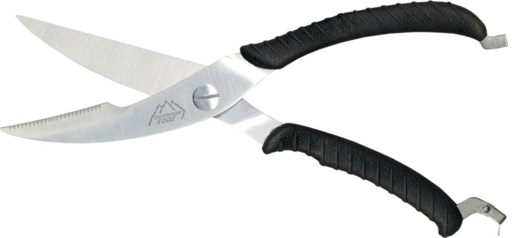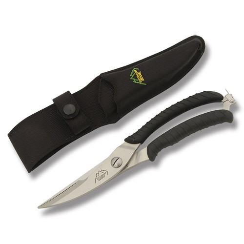 These are the sharpest, most powerful, spring loaded Game Shears available. They make easy work of field dressing birds, small game and fish. Features full-tang 420J2 stainless construction with non-slip rubberized TPR handles, serrated cutting edge and special bone breaking notch. The Game Shears come complete with a quality nylon sheath.