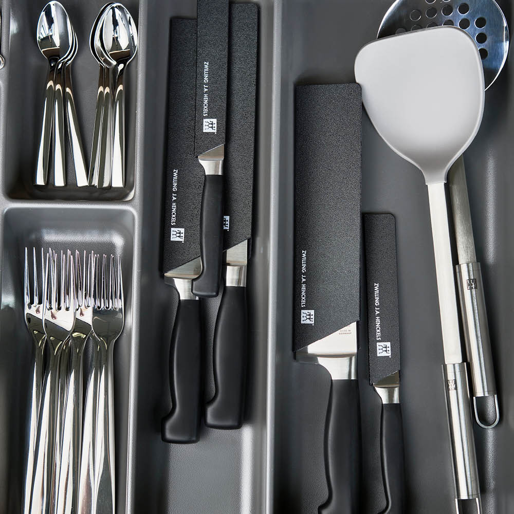 The practical knife sheath is used to store a knife with a blade of up to 21cm in length. The protective cover is 20cm long and 5 cm high. High-quality knives can be safely stored in the ZWILLING blade cover. The blade cover not only protects the knife blade and drawer, but also hands. The practical knife cover is made of robust plastic and has a soft fleece interior. Using the blade cover is easy because you simply need only to push the knife in. This means that it is always within reach in the drawer.