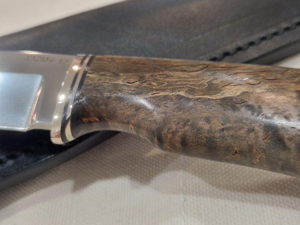 The composition has become well balanced and thanks to it the X12MF is so widely used. The letter “X” and the number “12” in the name indicate the average amount of chromium (CR) in the composition, it is 11-12.5%. As you know, chrome is an alloying additive responsible for the corrosion resistance of steel. Such an amount of this element in the composition allows us to consider X12MF relatively stainless steel. The carbon content (C), which is responsible for strength and hardness, is 1.45- 1.65 %. The hardness with proper heat treatment is 62-64 HRC, but as you know, high hardness entails an increase in fragility, and other alloying elements that increase the quality and technical characteristics of the steel, such as molybdenum ) 0.4-0.6%, Vanadium (V) 0.15-0.3%, manganese (MN) 0.15-0.45%, nickel (NI) up to 0.4%and in minimal quantities of silicon silicon (Si), phosphorus (p) and copper (CU). Based on all of the above, consider the pros and cons of the X12MF steel directly in the knives.