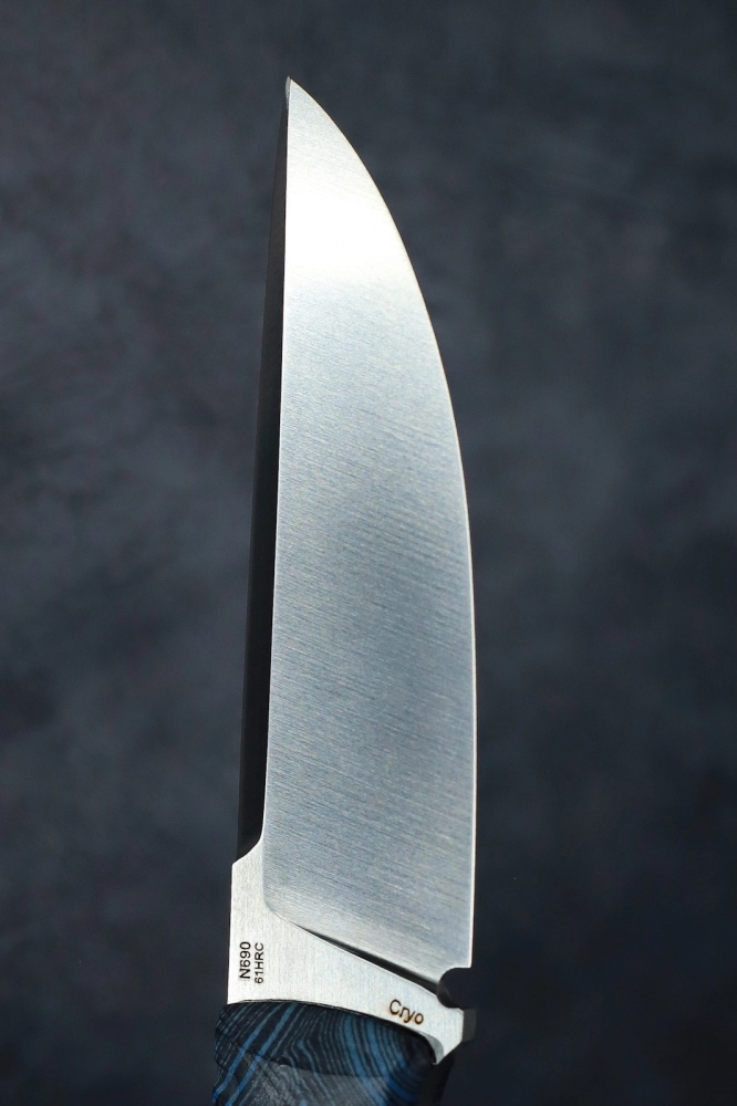 The knife is made of Böhler N690 stainless steel with a hardness of 61 HRC.