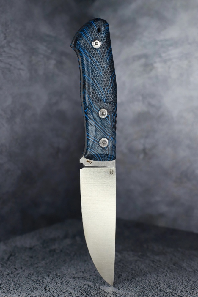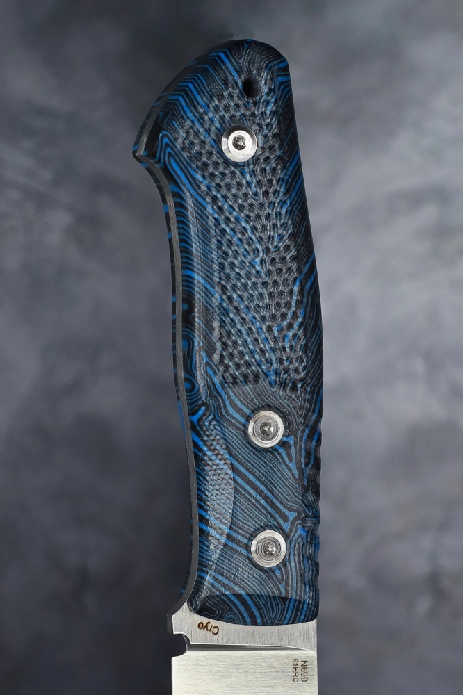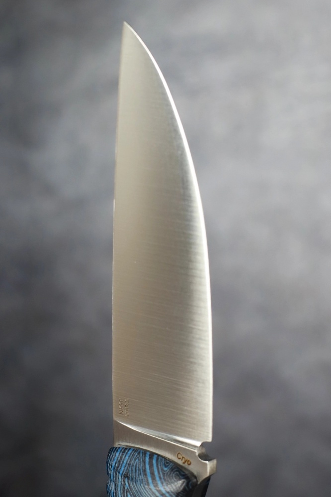 The knife is made of Böhler N690 stainless steel with a hardness of 61 HRC.