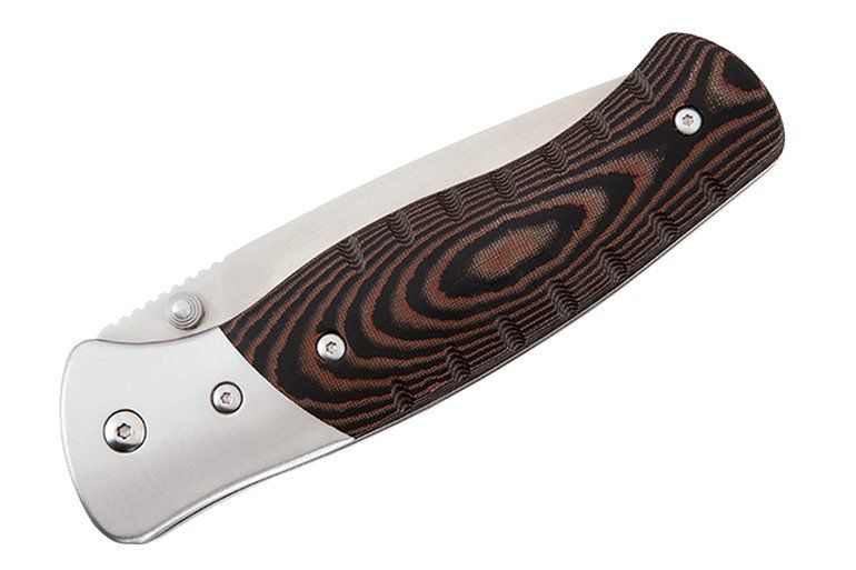 Named after the rugged Selkirk Mountain range beginning in the Northern Panhandle of Idaho, the 836 Folding Selkirk is a midsized folder with added features to help ensure survival in demanding conditions. Featuring a brown/black CNC contoured Micarta handle and 420HC steel blade, the Folding Selkirk fits easily in the sheath and can be configured for horizontal or vertical belt carry. It features a 2 1/4" ferrocerium striker with a whistle integrated in the grip.
