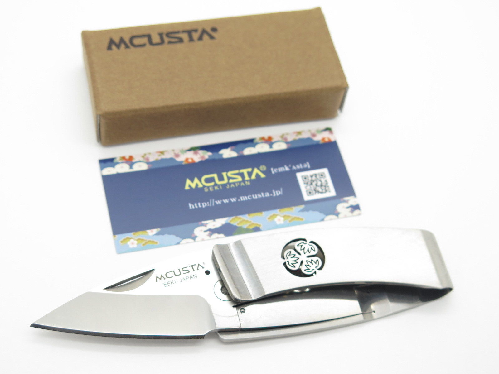 This Mcusta Kamon Series knife features the Aoi crest. Each money clip is laser engraved with a traditional Japanese family crest (Kamon). All stainless steel construction with an AUS-8 blade.