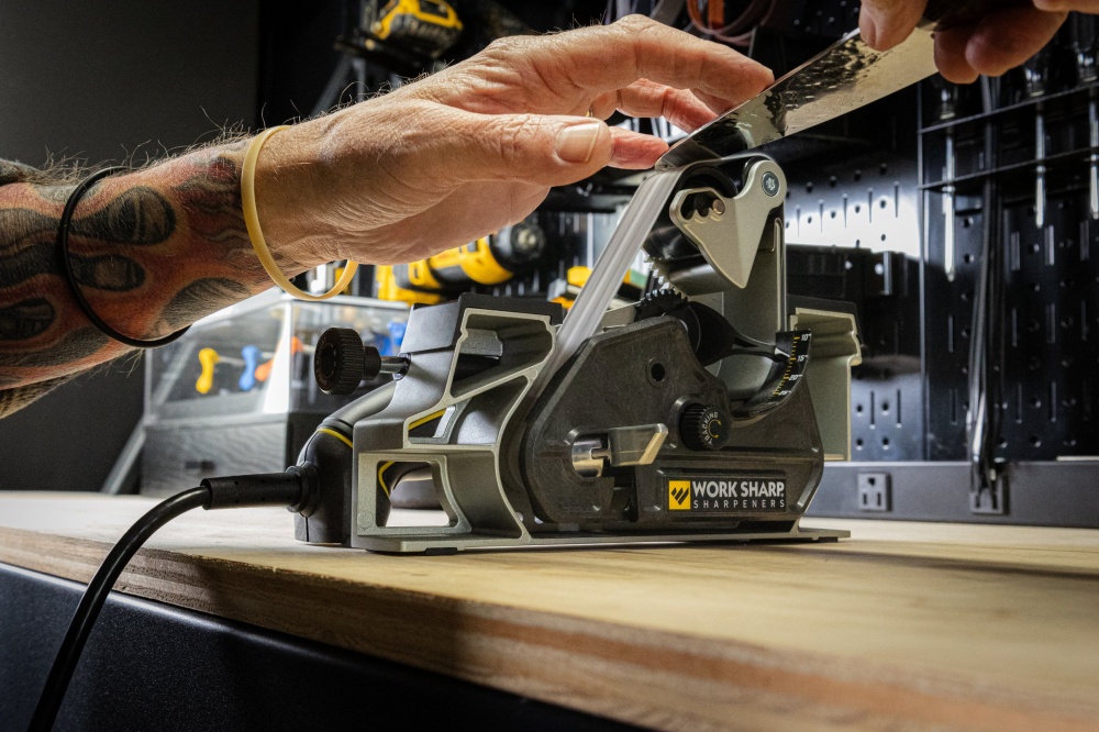 The Work Sharp Ken Onion MK.2 electric sharpener is not included in the set!