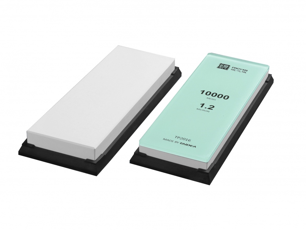 White corundum, one of the hardest minerals in the world, is attached to a tempered glass base in the Taida Glass series stones. This type of stone wears out much more slowly than traditional water stones, does not need to be soaked in water before use (just sprinkle with water) and most importantly, the stone can be used to the end, because the glass prevents the stone from breaking, even if the abrasive is a few millimeters.