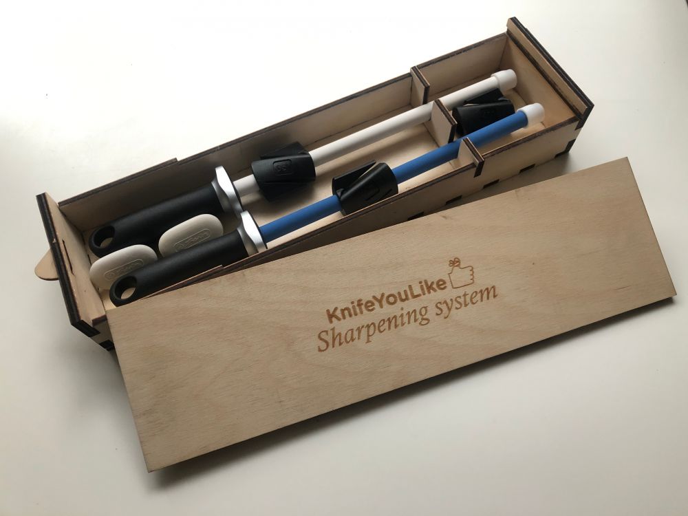 Knife Sharpening System (fine and coarse rods, 3 angle guides, Wood box with leather)