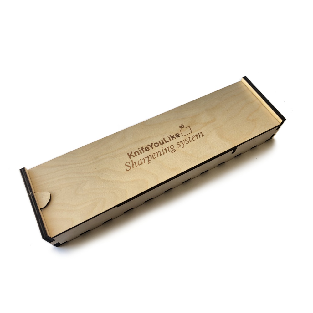 Turn over the box lid to find 4 small oaken pieces glued to it. Slide the blade on one of the oaken pieces to remove the burr after using a coarse rod.