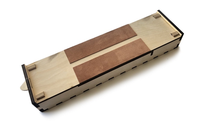 The lid, once turned over, also have leather strops for removing even the smallest burr after usage of a fine sharpening rod for exceptional sharpness.