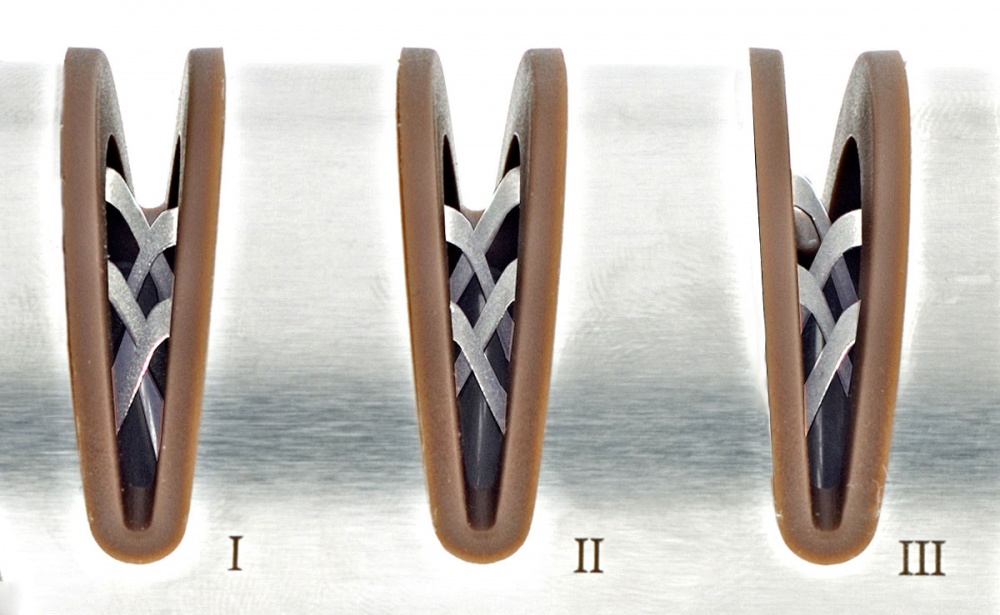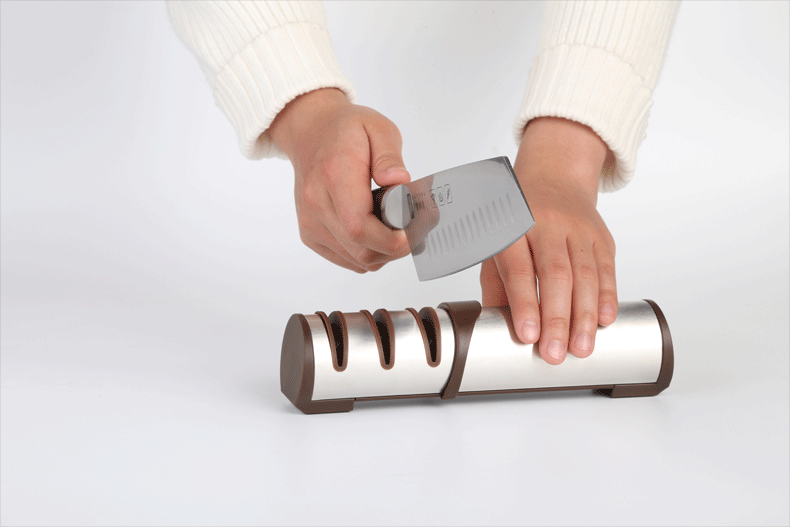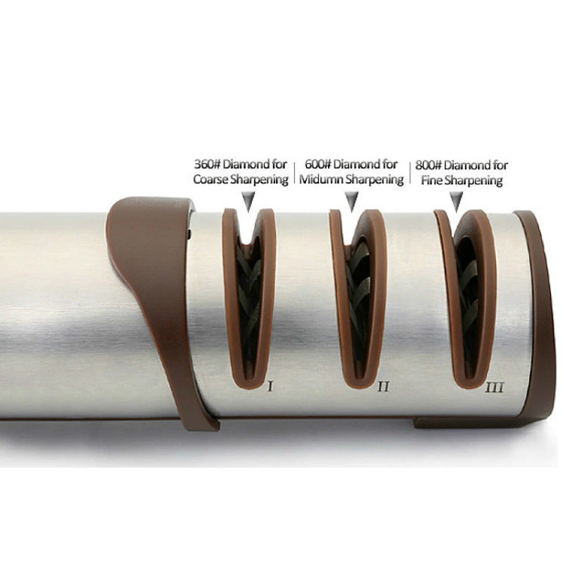 Three -step diamond knife sharpener. By replacing the rollers with diamond plates, knife sharpening has become much faster and easier. The streamlined housing made of brushed aluminum allows for a firm grip of the sharpener and looks very good in any kitchen.
