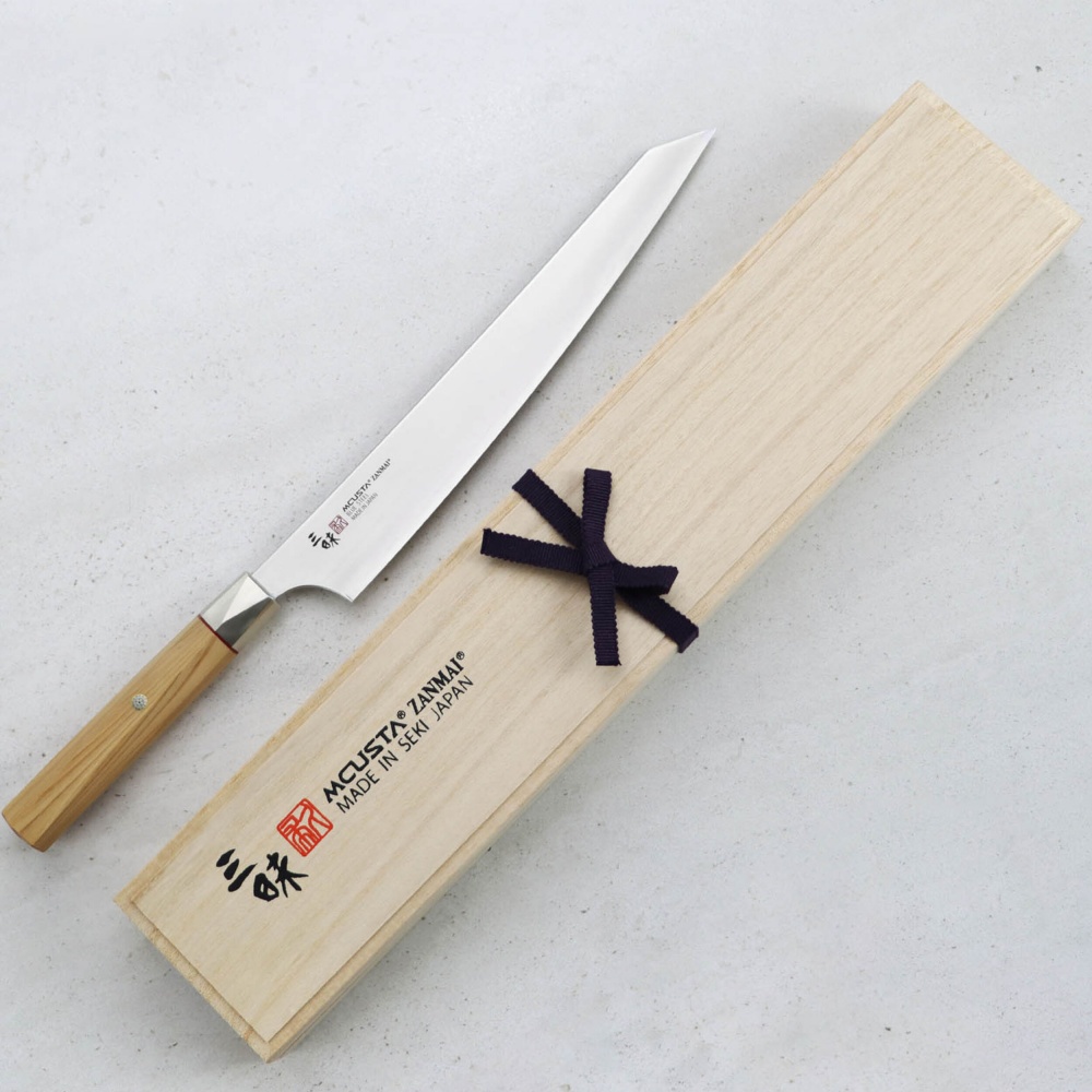 Sujihiki plāns griešanas nazis ar asmens garumu 24 cm no MCUSTA ZANMAI Beyond sērijas. Rokturis ir izgatavots no Hinoki koka, un asmens ir izgatavots no Aogami Super tērauda. Ražots Japānā.