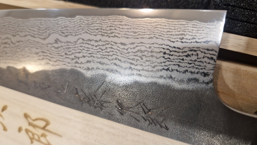 Runājot par nažiem, vienmēr pastāv kompromiss starp cietību (asa, bet trausla un mazāk nerūsējoša) un elastību (mazāk asi un mazāk trausli, vairāk nerūsējoši). TOJIRO izvēlējās daudzslāņu konstrukciju. Asmens kodols ir izgatavots no VG10 tērauda, kas pēc tam tiek aptverts starp 62 nerūsējošā tērauda slāņiem. Tādējādi jūs iegūstat unikālu cietības kombināciju un daudz augstāku izturību pret koroziju nekā oglekļa tēraudam. Asmens "brut de forge" apdare uzsver šī naža roku darbu.