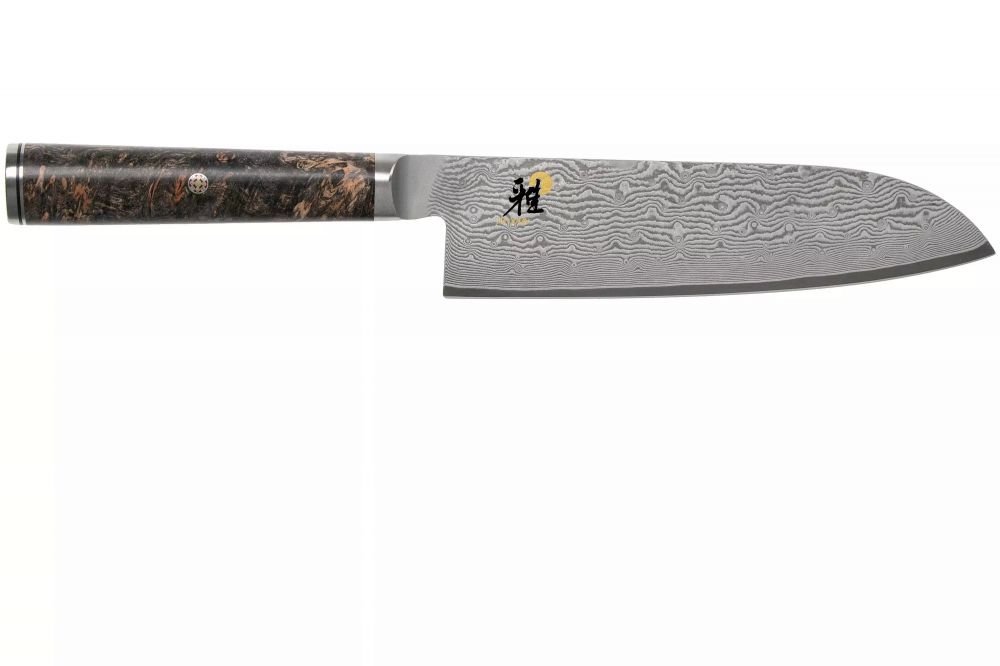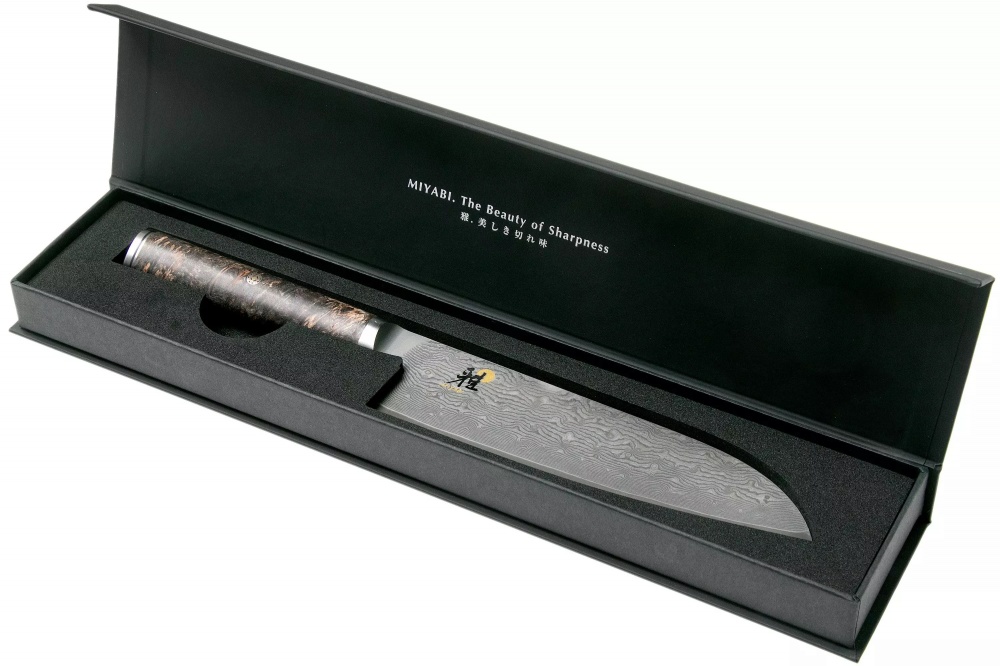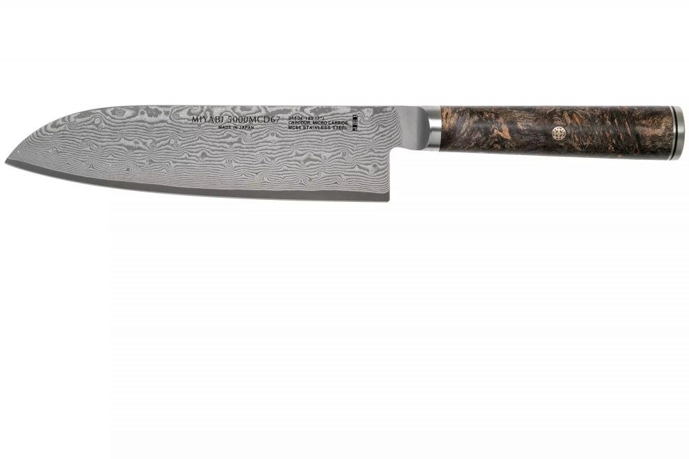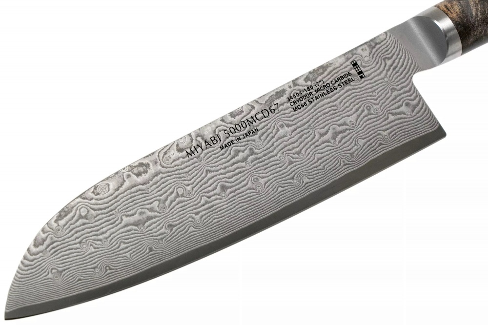 MIYABI 5000MCD 67 Santoku, 18cm asmens. Šim japāņu santoku ir ārkārtīgi ciets MicroCarbide pulvertērauda serdenis, kas nodrošina izcilu griešanas malu noturību un asumu. Santoku ir vislabāk pārdotā japāņu asmens forma, un nosaukums tiek tulkots kā "Trīs tikumi", tie ir gaļa, zivis un dārzeņi. Plakanā griešanas mala ir piemērota griešanai, nevis Eiropas pavāra nažu šūpojošajai griešanas kustībai. Asmens serdi ieskauj 132 ārējie tērauda slāņi, kas veido unikālo Damaskas dizaina rakstu uz asmens. Griešanas mala ir Honbazuke slīpēta un simetriska (nevis viena slīpa), tāpēc to var izmantot gan labroči, gan kreiļi. Nav pirkstu aizsarga, tāpēc var izmantot visu griešanas malu. Melnais oša koka rokturis ērti atrodas rokā, nodrošinot stingru kontroli un nenogurstošu darbu. Tāpat kā ar visu šo īpašo, ir jābūt uzmanīgiem. Ieteicams mazgāt tikai ar rokām, kopt un asināt uz kaltas akmens, kā arī jāizvairās no stikla, keramikas vai akmens griešanas dēļu izmantošanas.