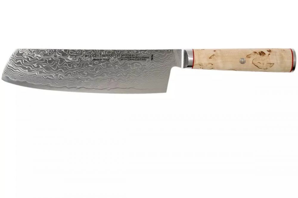Miyabi 5000MCD nāk no Zwilling J. A. Henckels rūpnīcas Seki, Japānā. Pārsteidzoši ir ergonomiski veidotais rokturis ar Masur bērza D formu un skaistais damaskas tērauda zīmējums uz asmens.