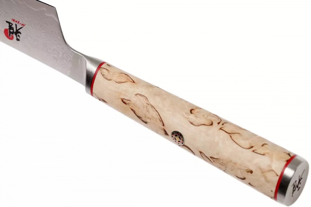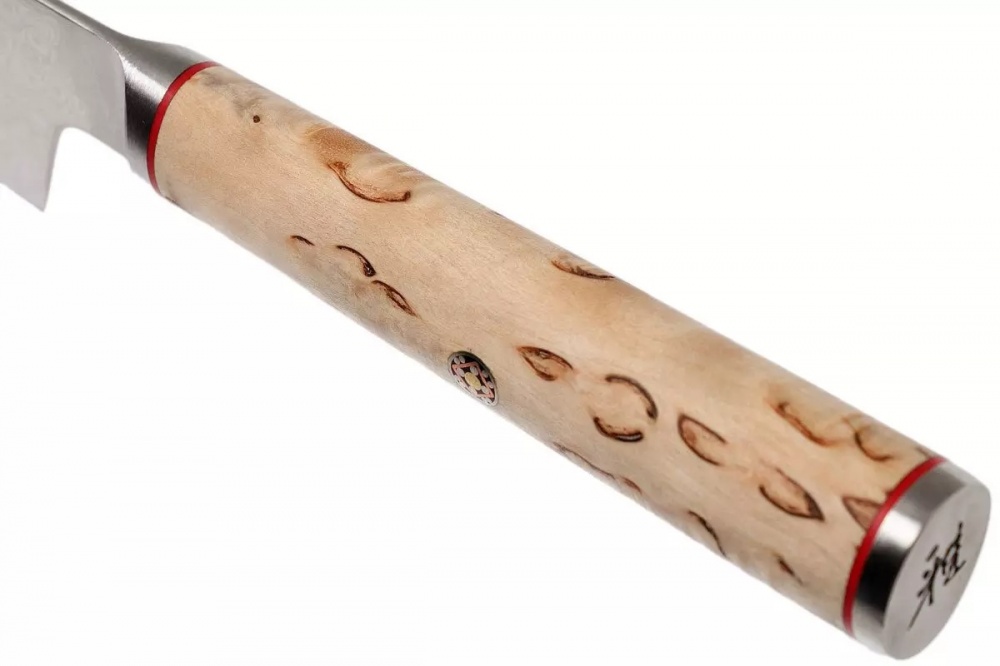 Masur bērza koka rokturis, D veida rokturis ir izgatavots no Masur bērza koka. Šim kokam ir skaists dabisks raksts, kas padara katru nazi unikālu. Roktura vidū ir lieliska mozaīkas tapa – vēl viena satriecoša detaļa, kas izceļ šīs kolekcijas izcilo apdari un uzmanību detaļām. Dabiskā koka siltums patīkami kontrastē arī ar Damaskas tērauda asmeni. Un kā zvaigznes atrakcija Miyabi logotips ir skaisti iegravēts rokturī