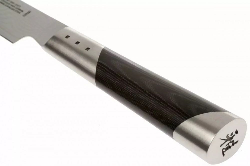 Šim modernā izskata japāņu virtuves nazim ir rokturis, kas izgatavots no augstas kvalitātes nerūsējošā tērauda, ​​kas inkrustēts ar mikartu. Tas ir lina un sintētisko sveķu plastmasas kompozīts, kas atgādina koku. Tā priekšrocība salīdzinājumā ar koku ir tā, ka mikartu ir viegli tīrīt, pateicoties tās ūdensizturībai.