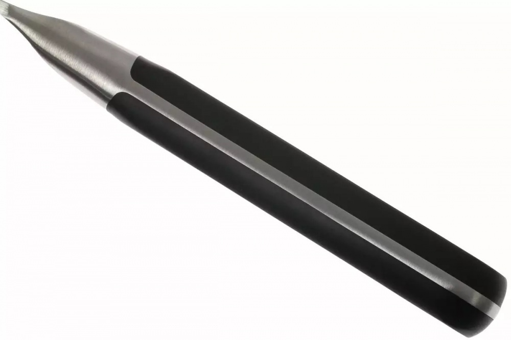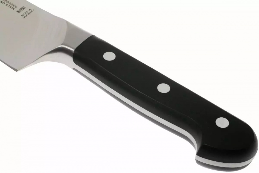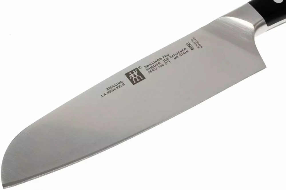 Asmens ir izgatavots no ledus rūdīta Friodur tērauda. Ražošanas procesā šāda veida tērauds 4 posmos tiek uzkarsēts līdz 1000 ° C, pēc tam atdzesēts līdz -70 ° C. Šī tehnoloģija, kuru pilnveidoja uzņēmums Zwilling, nodrošina, ka asums, izturība, elastība un izturība pret koroziju atbilst absolūti augstākais iespējamais standarts. Naža asināšana notiek 5 soļos. Rezultāts ir nevainojama naža mala. Balsts nesaskaras ar asmens malu, kas nozīmē, ka nazi ir salīdzinoši viegli uzasināt uz ūdens akmens.