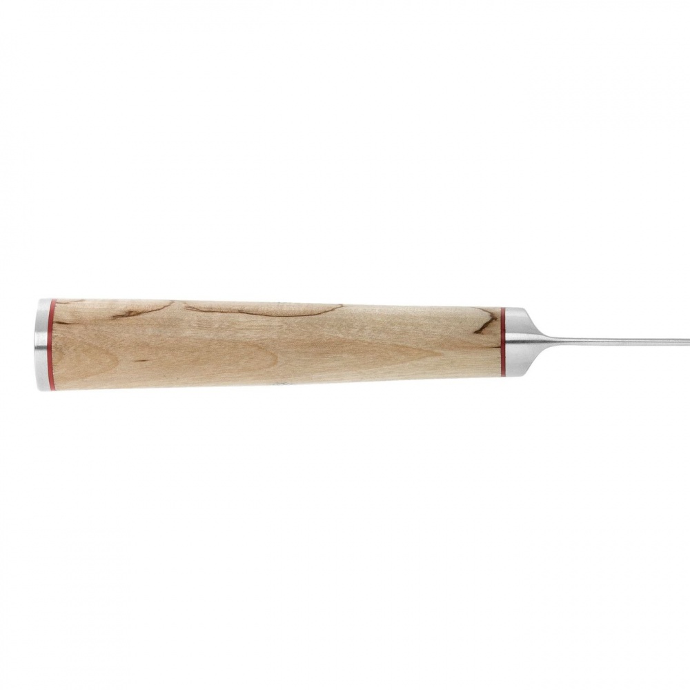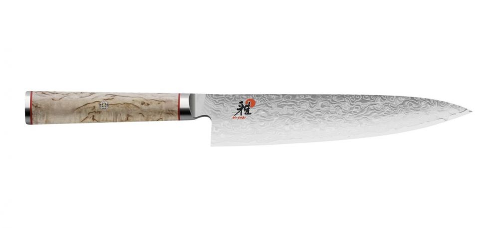 Masur bērza koka rokturis, D veida rokturis ir izgatavots no Masur bērza koka. Šim kokam ir skaists dabisks raksts, kas padara katru nazi unikālu. Roktura vidū ir lieliska mozaīkas tapa – vēl viena satriecoša detaļa, kas izceļ šīs kolekcijas izcilo apdari un uzmanību detaļām. Dabiskā koka siltums patīkami kontrastē arī ar Damaskas tērauda asmeni. Un kā zvaigznes atrakcija Miyabi logotips ir skaisti iegravēts rokturī.