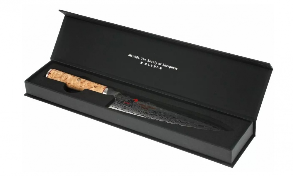 Miyabi 5000MCD nāk no Zwilling J. A. Henckels rūpnīcas Seki, Japānā. Pārsteidzoši ir ergonomiski veidotais rokturis ar Masur bērza D formu un skaistais damaskas tērauda zīmējums uz asmens.