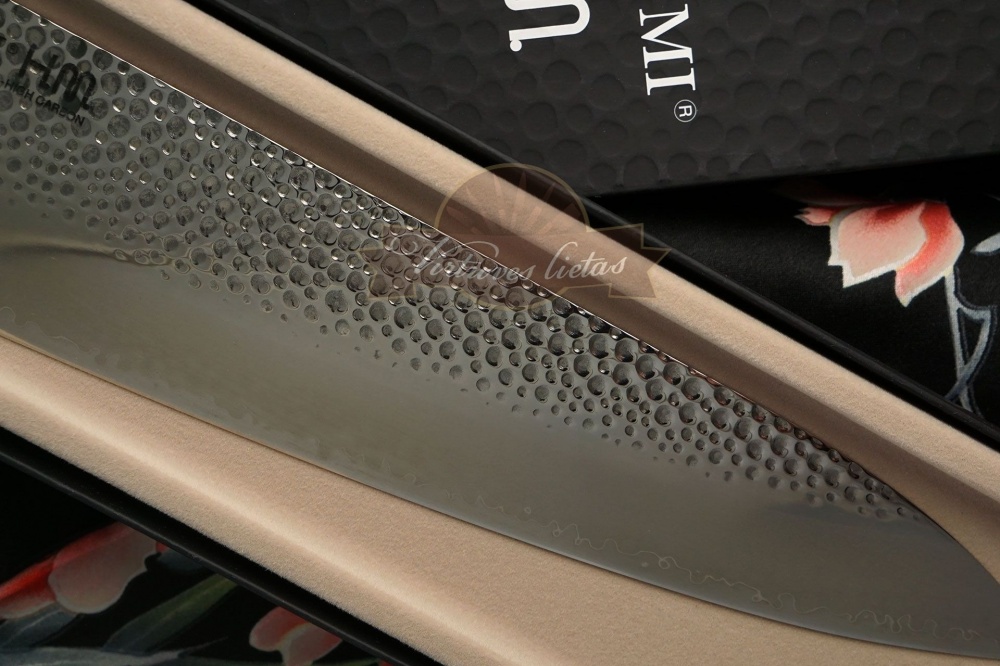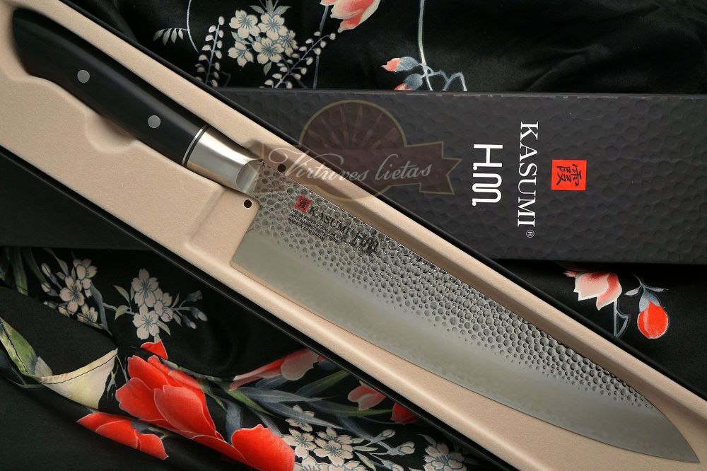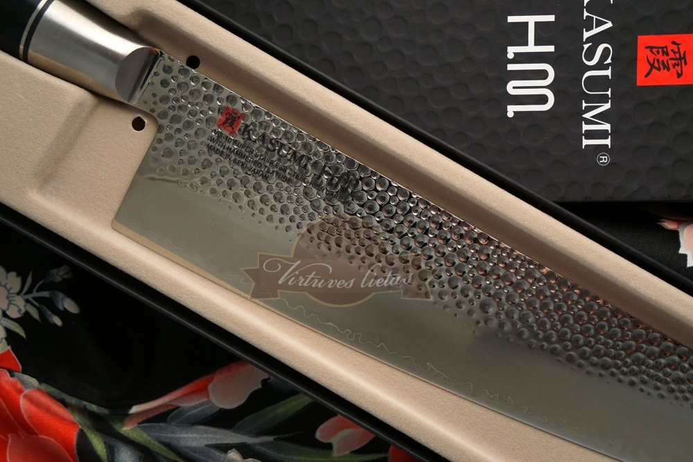 Kasumi HM sērija. Īpaši cietais sakausējums VG-10 tiek izmantots kā asmens pamatmateriāls. Šim nazim ir trīsslāņu struktūra, kas no abām pusēm notur pamatmateriālu ar korozijizturīgu nerūsējošo tēraudu. Seki kvalificētie amatnieki ir atbildīgi par asmeņa montāžu. Hammered sērijas nažu raksts ir kalts ar daudziem sīkiem ievilkumiem, griešanas laikā rada gaisa kabatas, lai novērstu pārtikas pielīmēšanu. Īpaša VG10 asmens kodola rūdīšana rada malu noturību, kas ievērojami pārsniedz citu līdzīgu virtuves nazu zīmolus. Rokturis ir izgatavots no POM, materiāla, kas padara to ērtu, izturīgu, higiēnisku un ilgstošu.