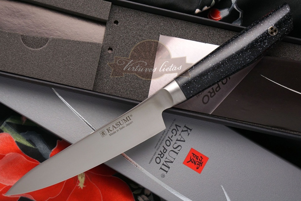 Šī jaunākās paaudzes Kasumi VG-10 Pro naži ir kalti no viena cieta VG-10 augsta oglekļa līmeņa nerūsējošā tērauda gabala. Skaists ergonomiskais rokturis ir izgatavots no izturīgiem marmora sveķiem ar spīdīgu apdari un ir dekorēts ar mozaīkas tapu. Asmeņi ir HRC 60-61, kas ir ideāla cietība augstas kvalitātes profesionāliem virtuves nažiem un garantē labāku griezumu un ilgāku kalpošanas laiku nekā lielākā daļa citu nažu.