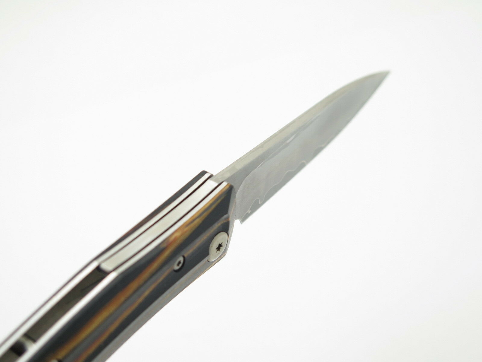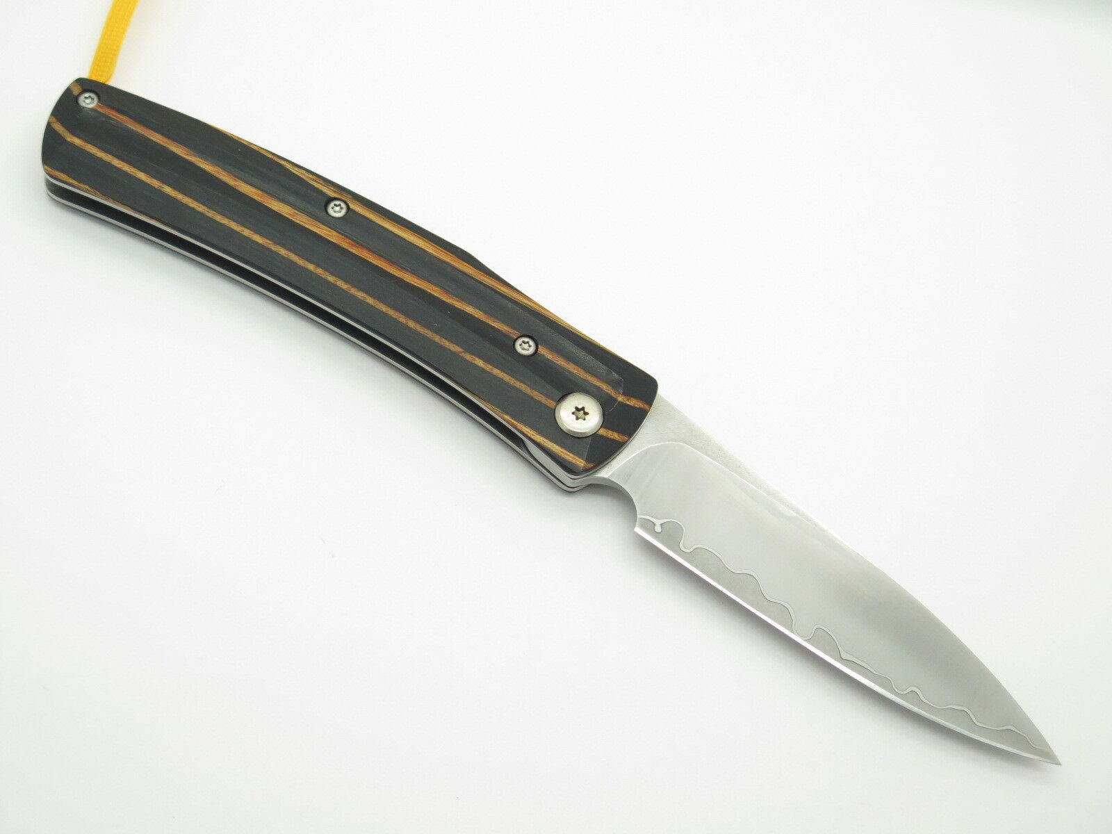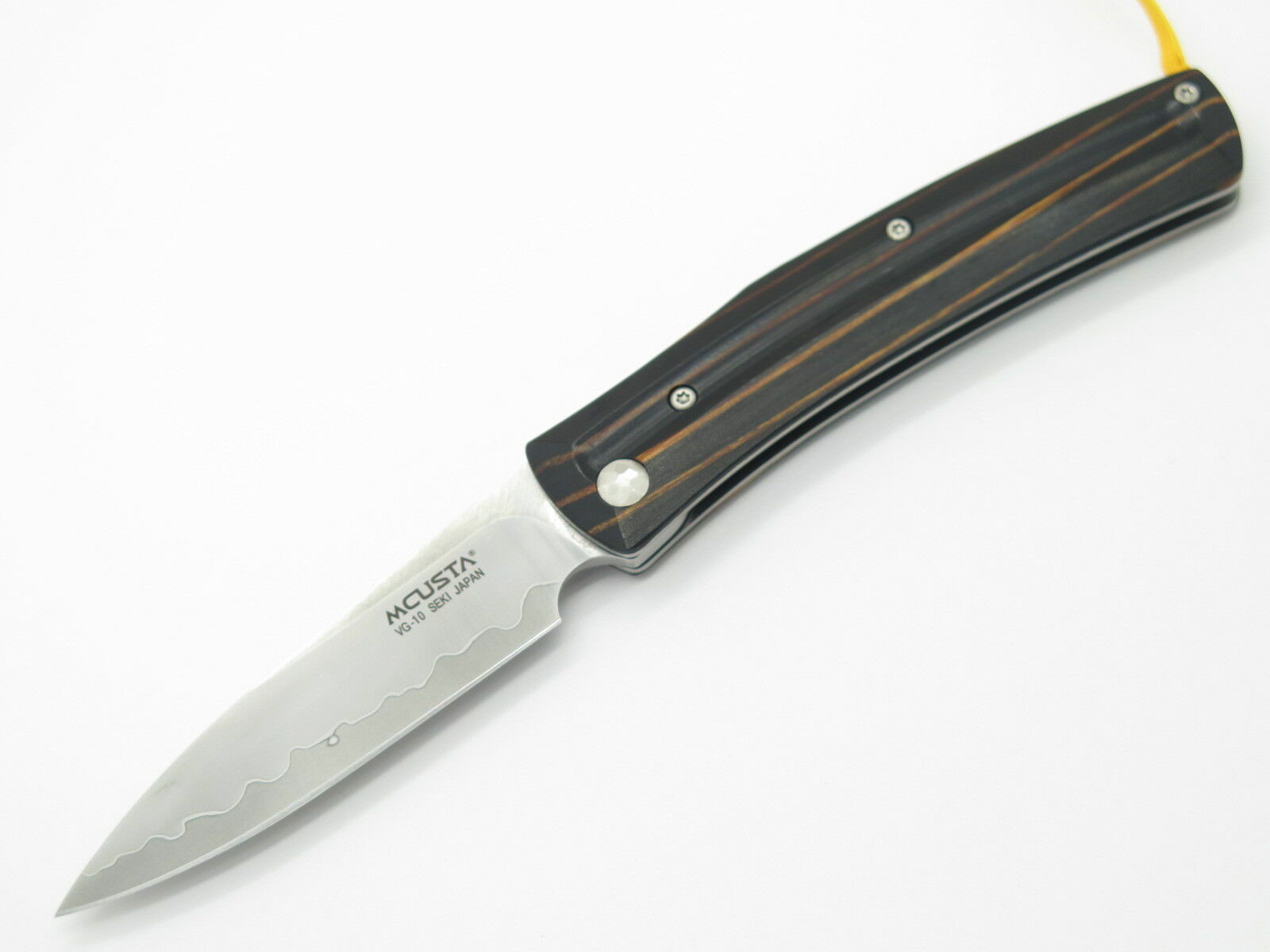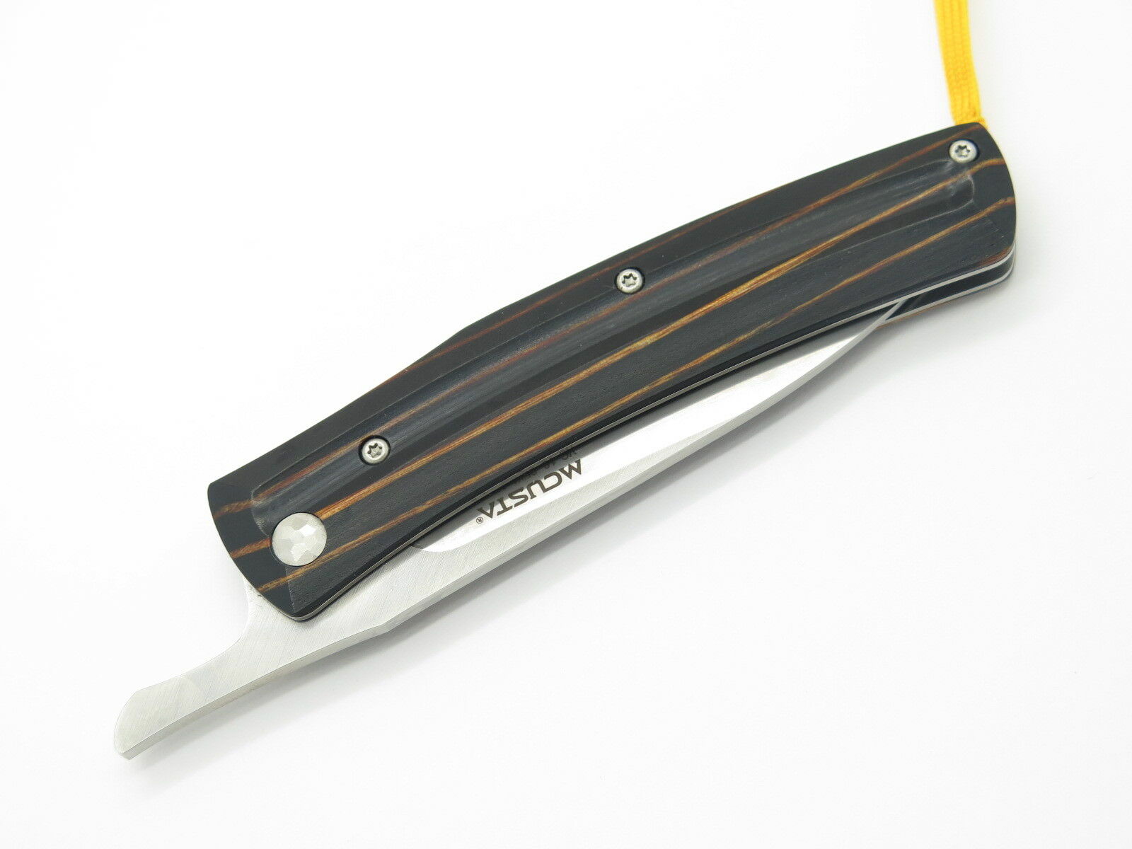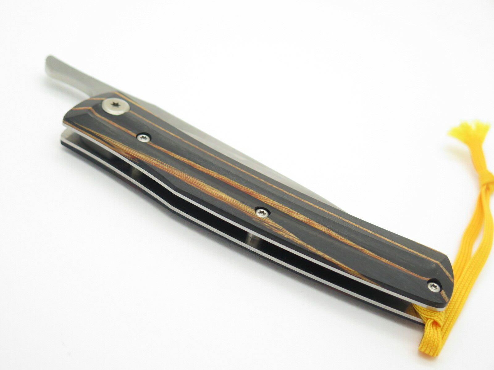 Нож Mcusta Higonokami - складной нож с удлинением в задней части клинка, служащим для легкого открытия. Длина клинка 83 мм. Клинок изготовлен из трехслойной стали: сердцевина VG10 в обкладках из нержавеющей стали. Эргономичная рукоять изготовлена из древесины Pakkawood. В комплекте традиционный японский чехол Nishijin.